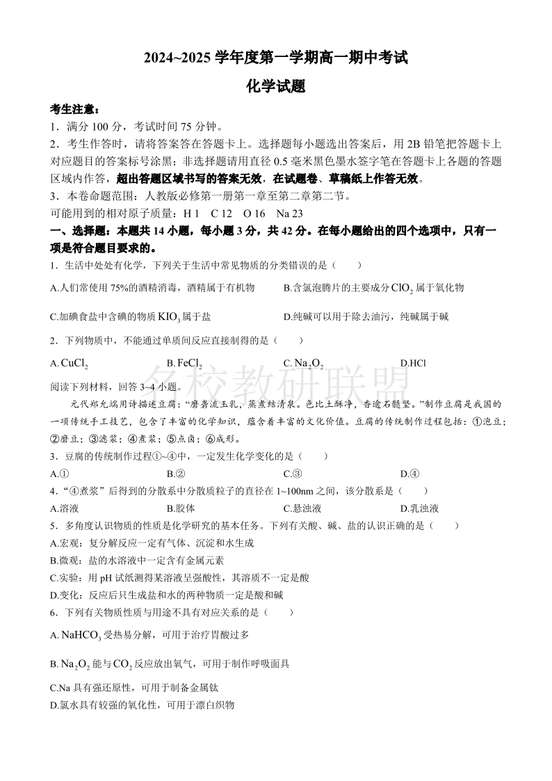 安徽省滁州市九校联考2024-2025学年高一上学期11月期中考试 化学