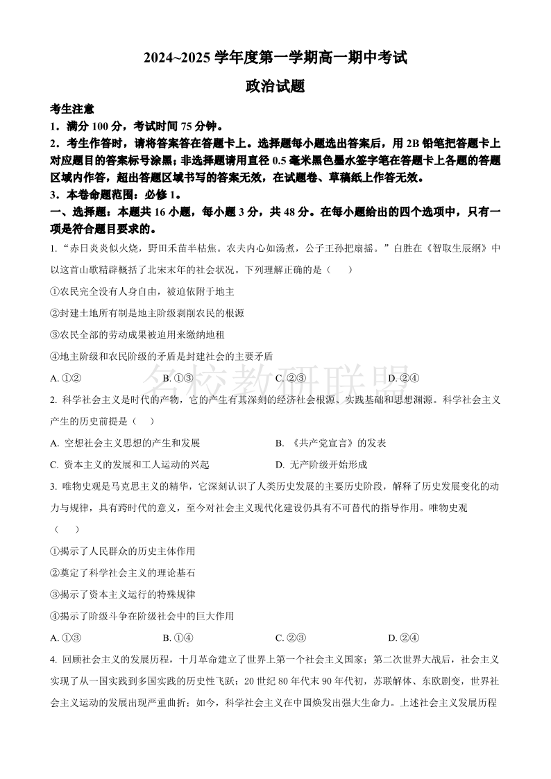 安徽省滁州市九校联考2024-2025学年高一上学期11月期中考试 政治