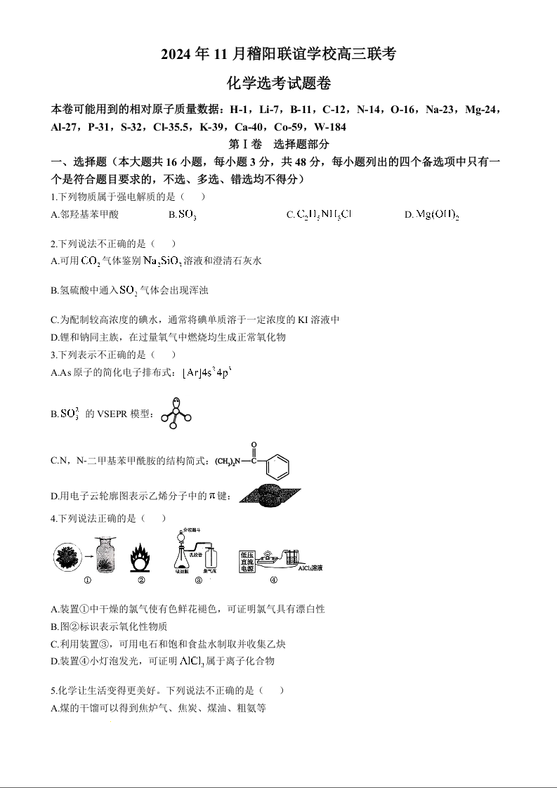 浙江省稽阳联谊学校2025届高三上学期11月联考化学+答案