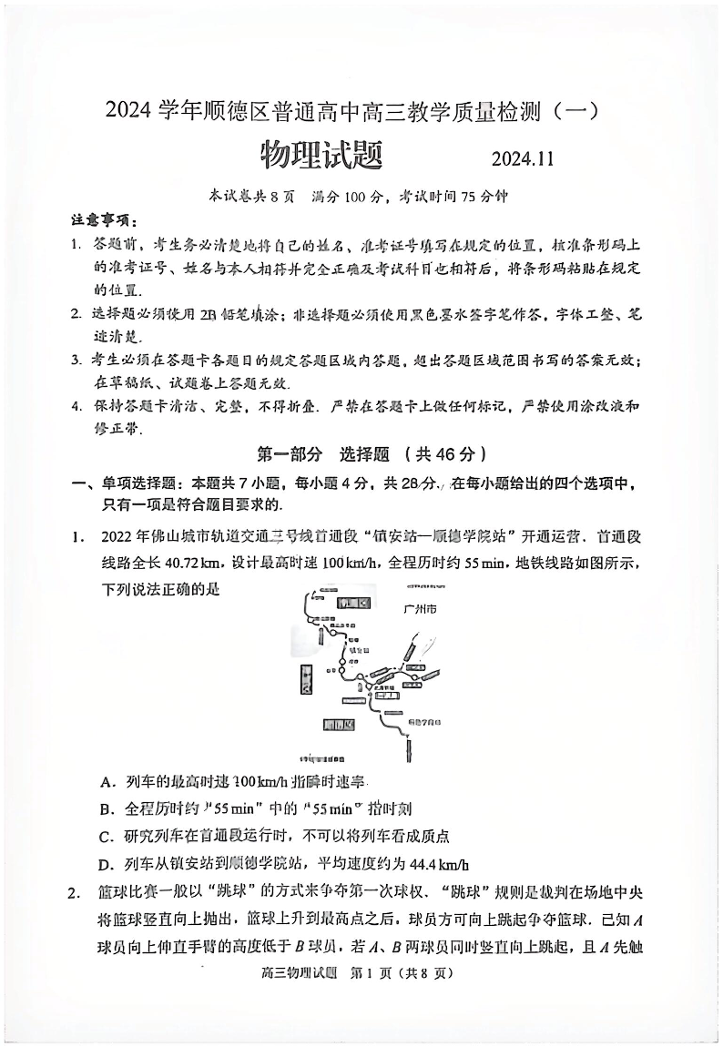 广东省佛山市2024学年顺德区普通高中高三教学质量检测(一) 物理