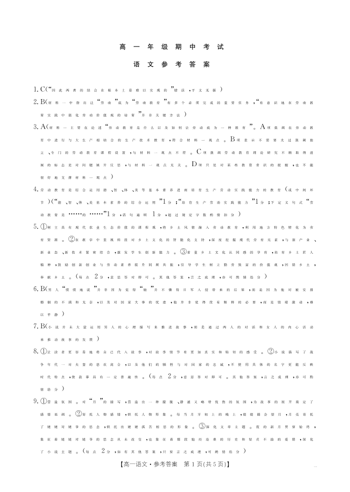 河北省唐山市2024-2025学年高一上学期期中考试 语文答案