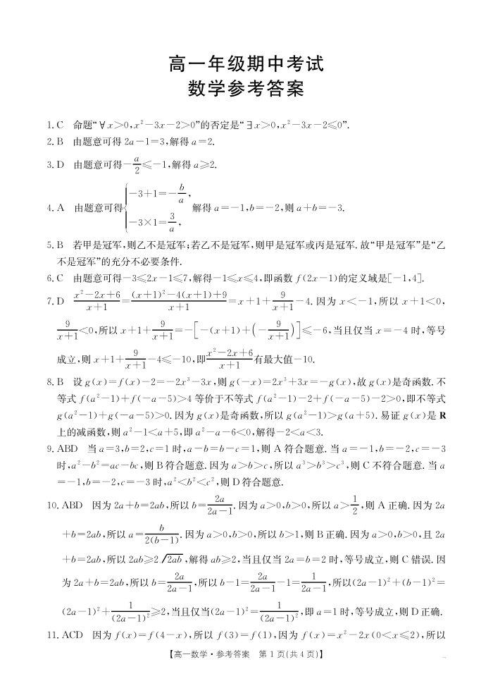 河北省唐山市2024-2025学年高一上学期期中考试 数学答案