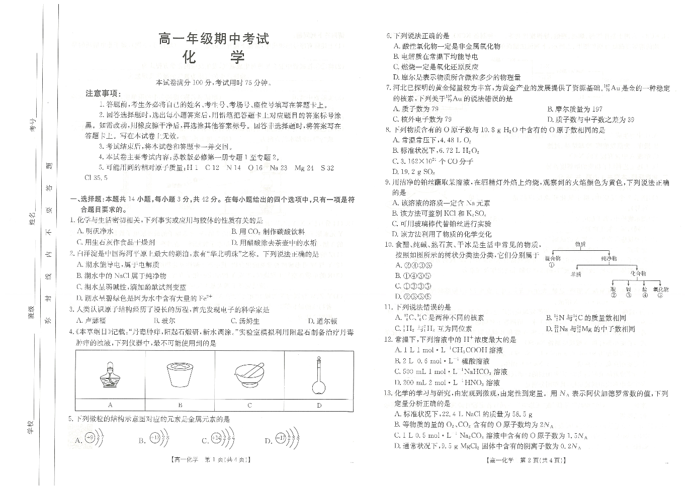 河北省唐山市2024-2025学年高一上学期期中考试 化学