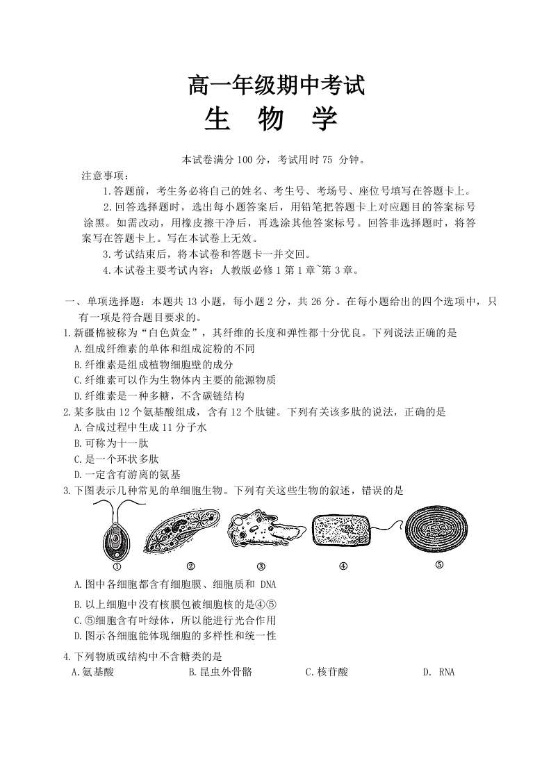 河北省唐山市2024-2025学年高一上学期期中考试 生物