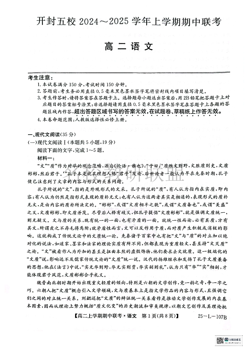 河南省开封五校2024-2025学年高二11月期中联考 语文