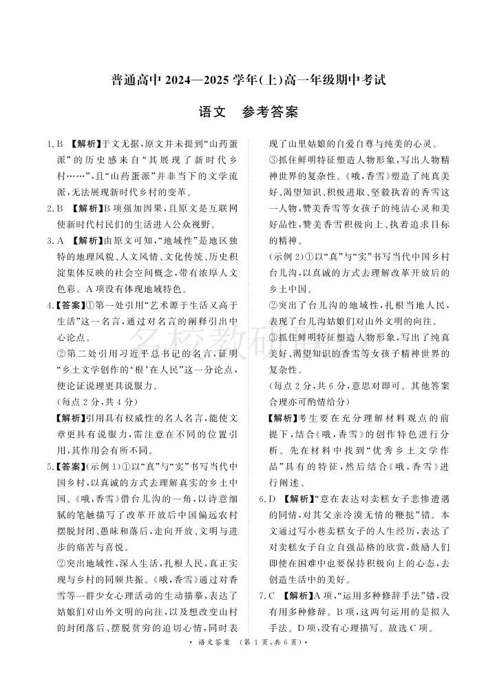 河南省青桐鸣普通高中2024-2025学年高一11月期中考试 语文答案