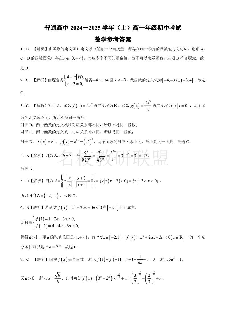 河南省青桐鸣普通高中2024-2025学年高一11月期中考试 数学答案