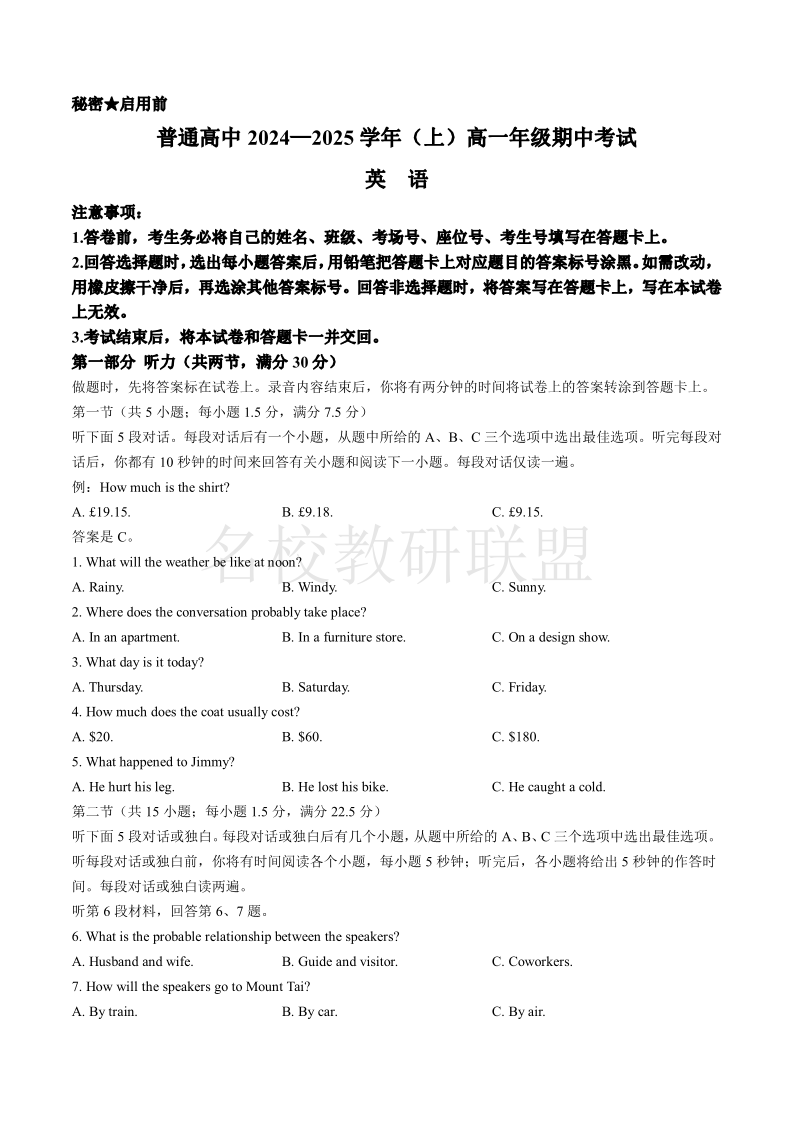 河南省青桐鸣普通高中2024-2025学年高一11月期中考试 英语