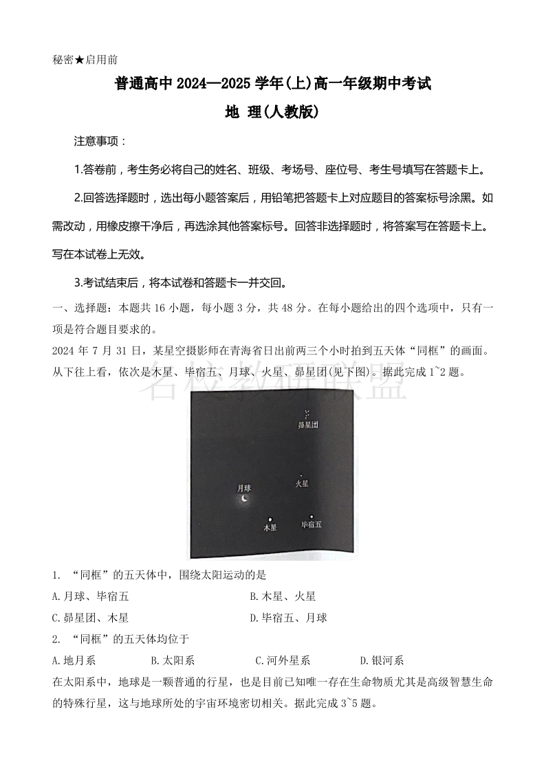 河南省青桐鸣普通高中2024-2025学年高一11月期中考试 地理