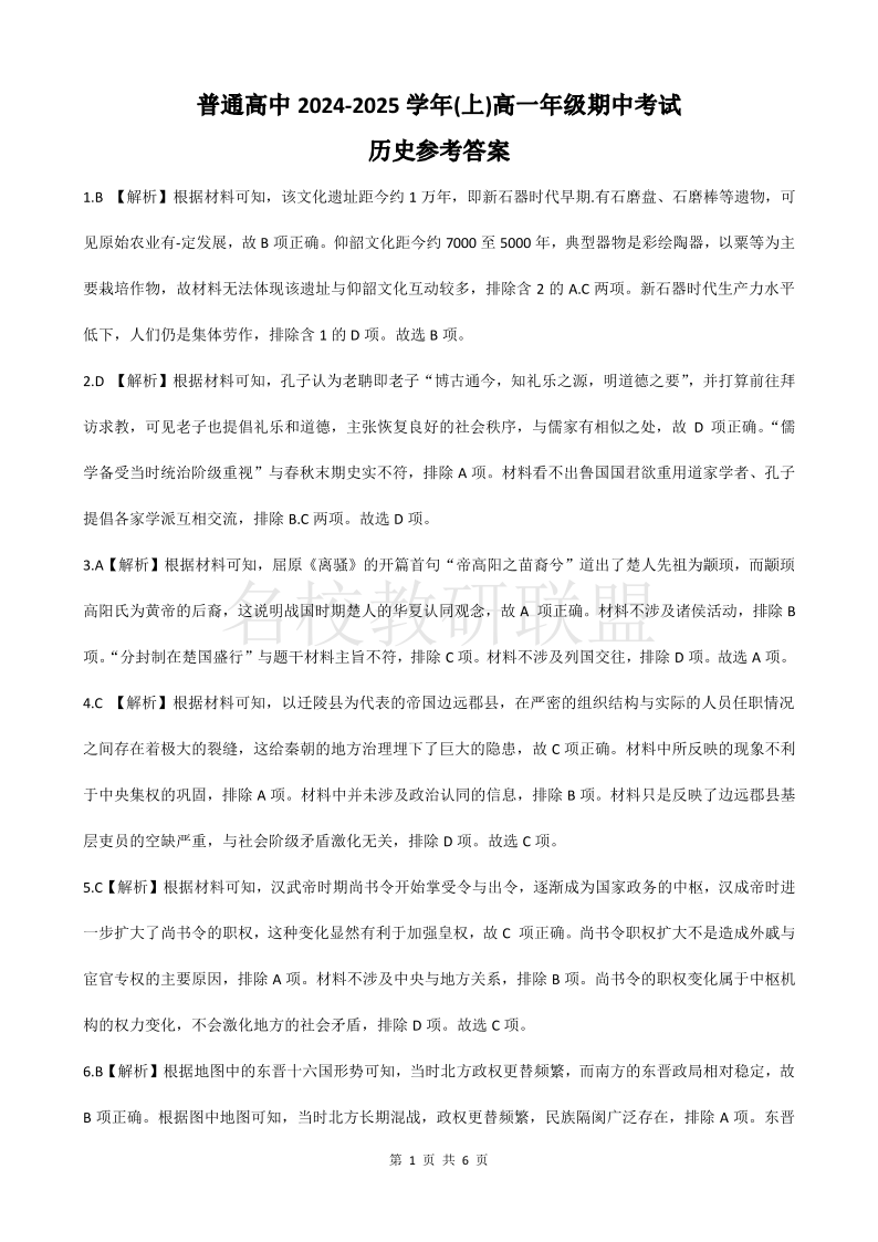 河南省青桐鸣普通高中2024-2025学年高一11月期中考试 历史答案