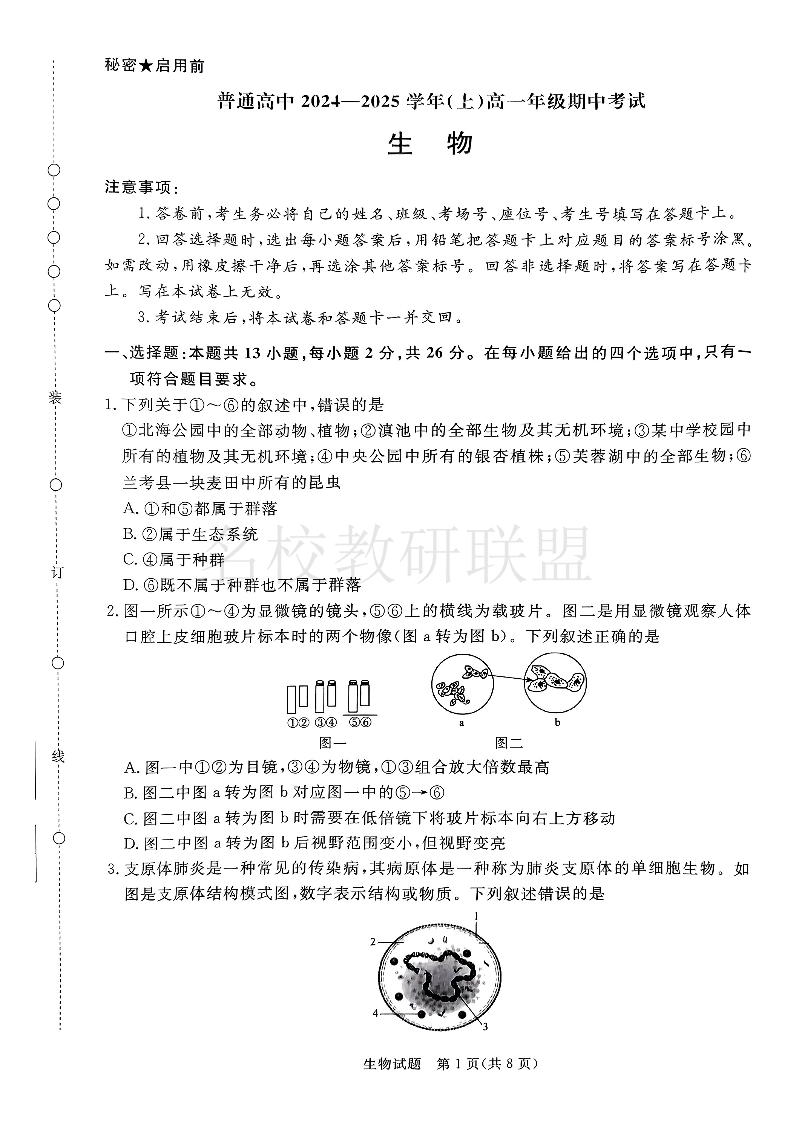 河南省青桐鸣普通高中2024-2025学年高一11月期中考试 生物