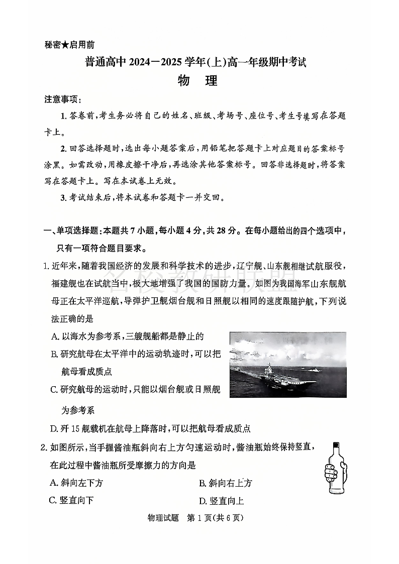 河南省青桐鸣普通高中2024-2025学年高一11月期中考试 物理