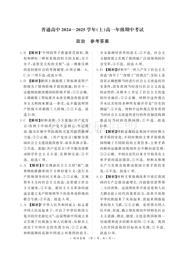 河南省青桐鸣普通高中2024-2025学年高一11月期中考试 政治答案