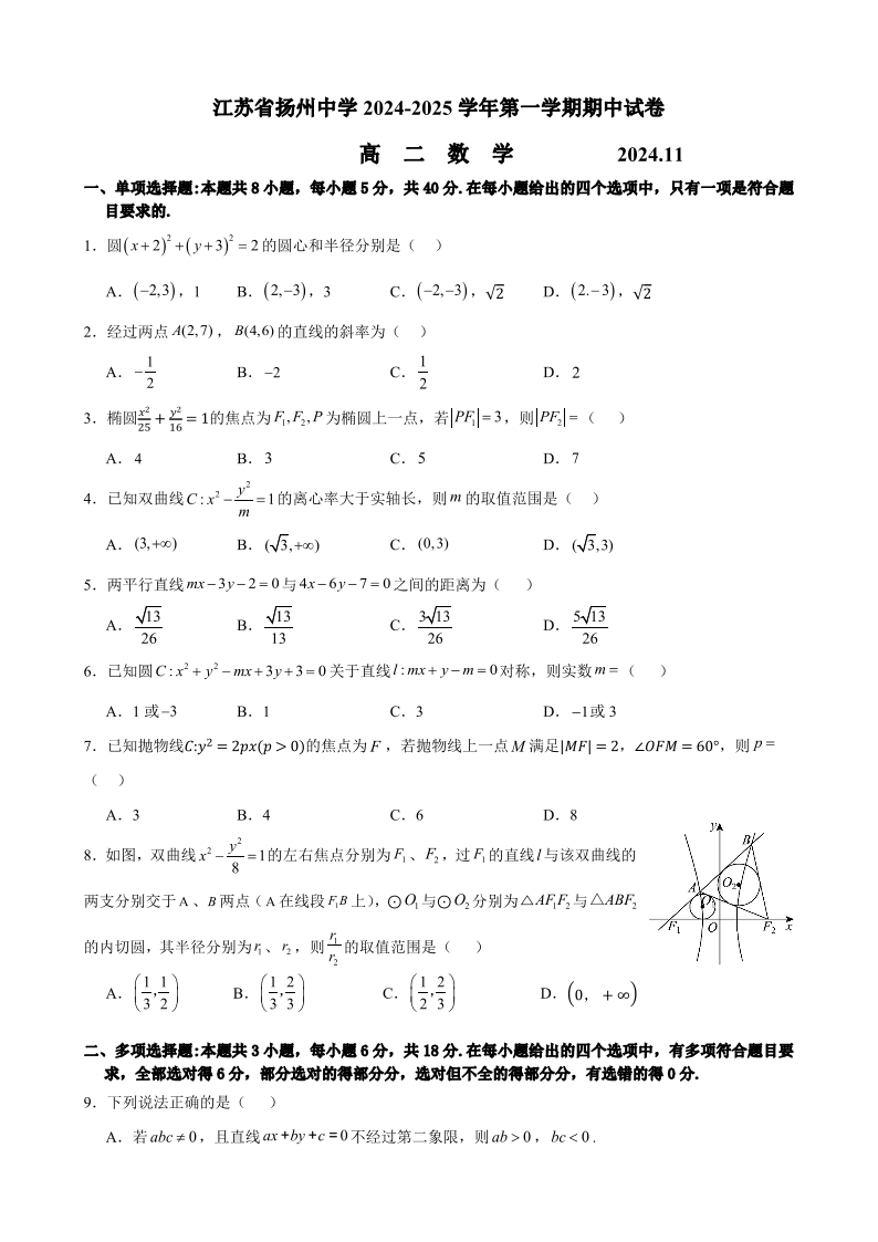 江苏省扬州中学2024-2025学年高二年级第一学期期中试卷 数学