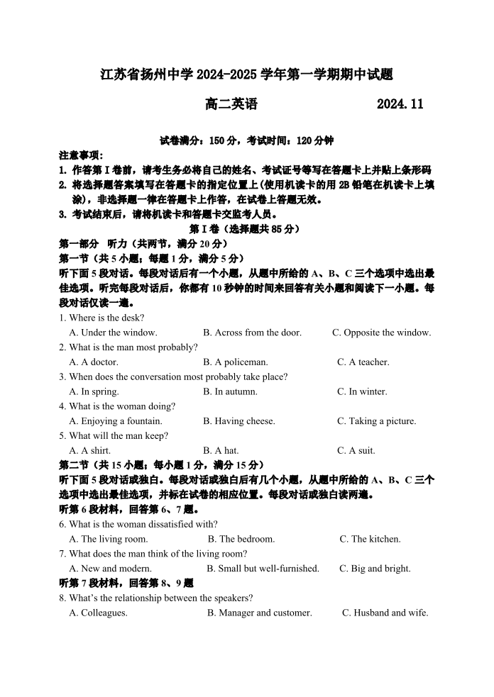 江苏省扬州中学2024-2025学年高二年级第一学期期中试卷 英语