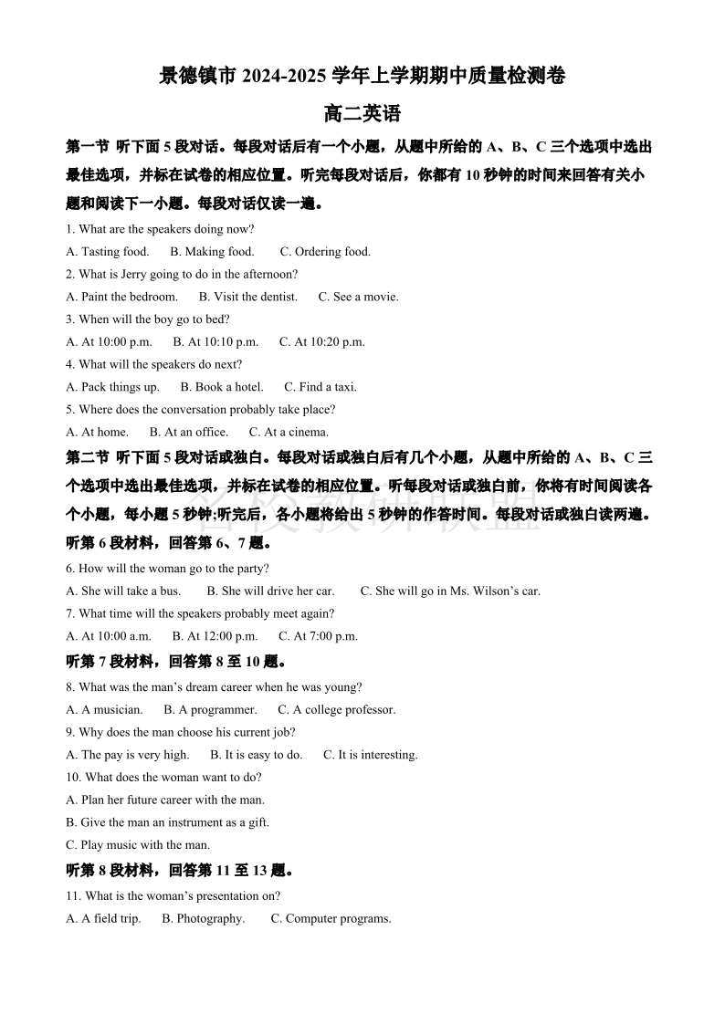江西省景德镇市2024-2025学年高二上学期期中检测 英语