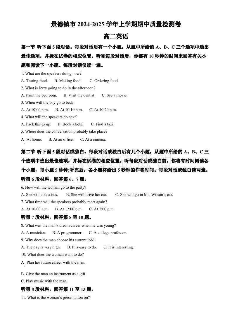 江西省景德镇市2024-2025学年高二上学期期中检测 英语答案