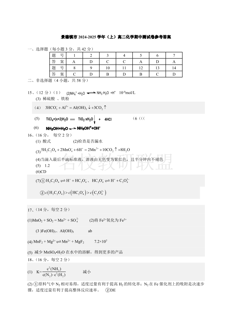江西省景德镇市2024-2025学年高二上学期期中检测 化学答案
