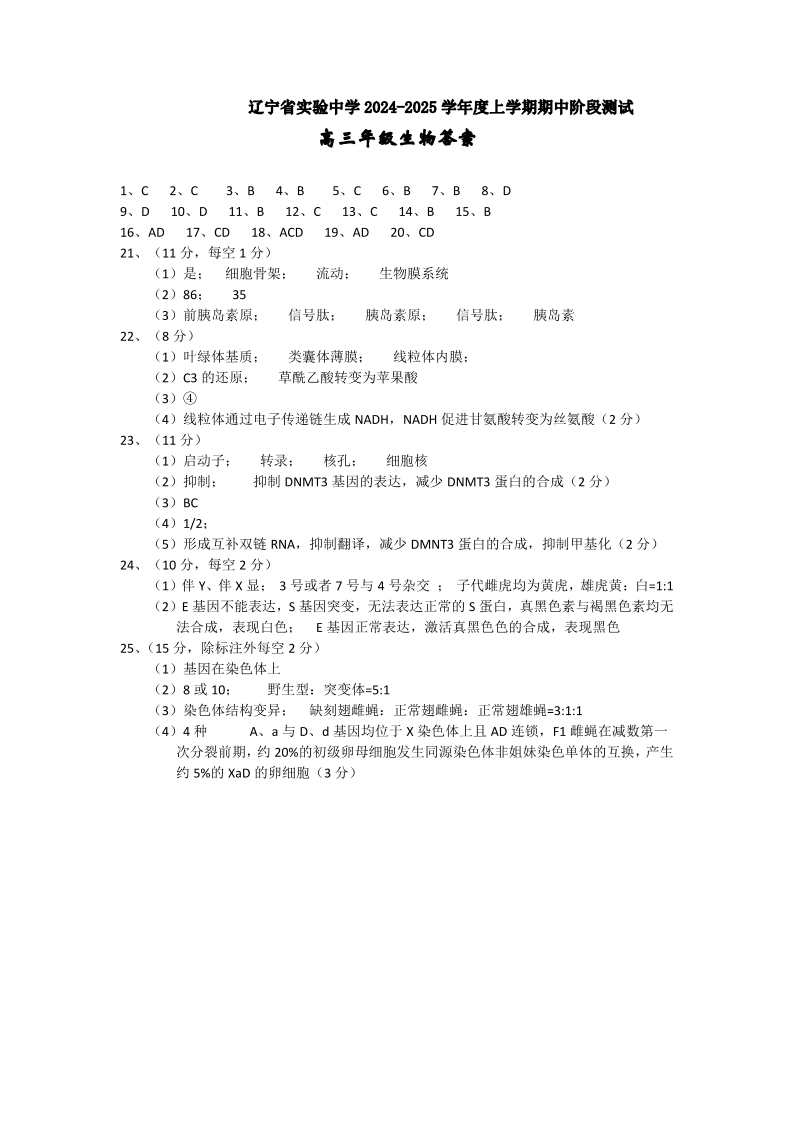 辽宁省实验中学2024-2025学年度高三上学期期中阶段测试 生物答案