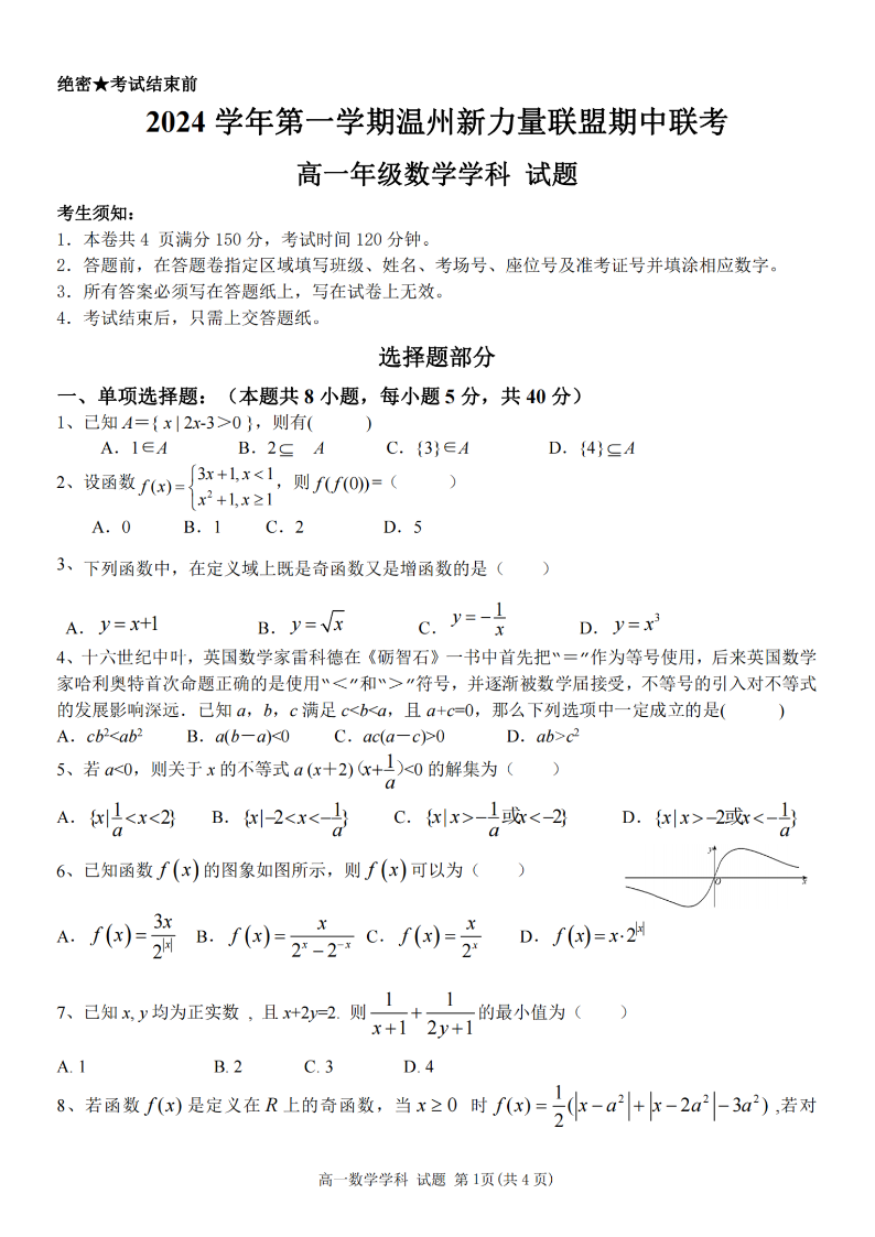 温州新力量联盟2024学年高一第一学期期中联考 数学