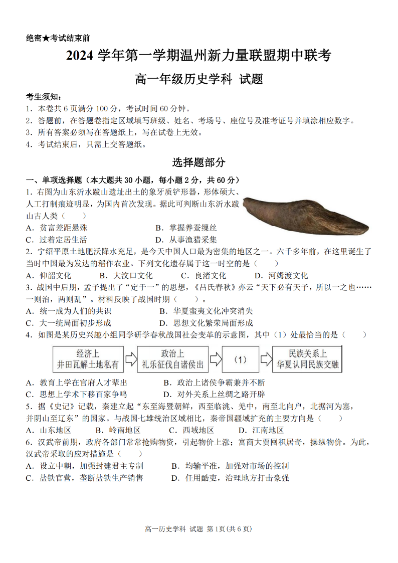 温州新力量联盟2024学年高一第一学期期中联考 历史