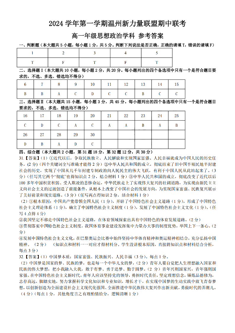 温州新力量联盟2024学年高一第一学期期中联考 政治答案