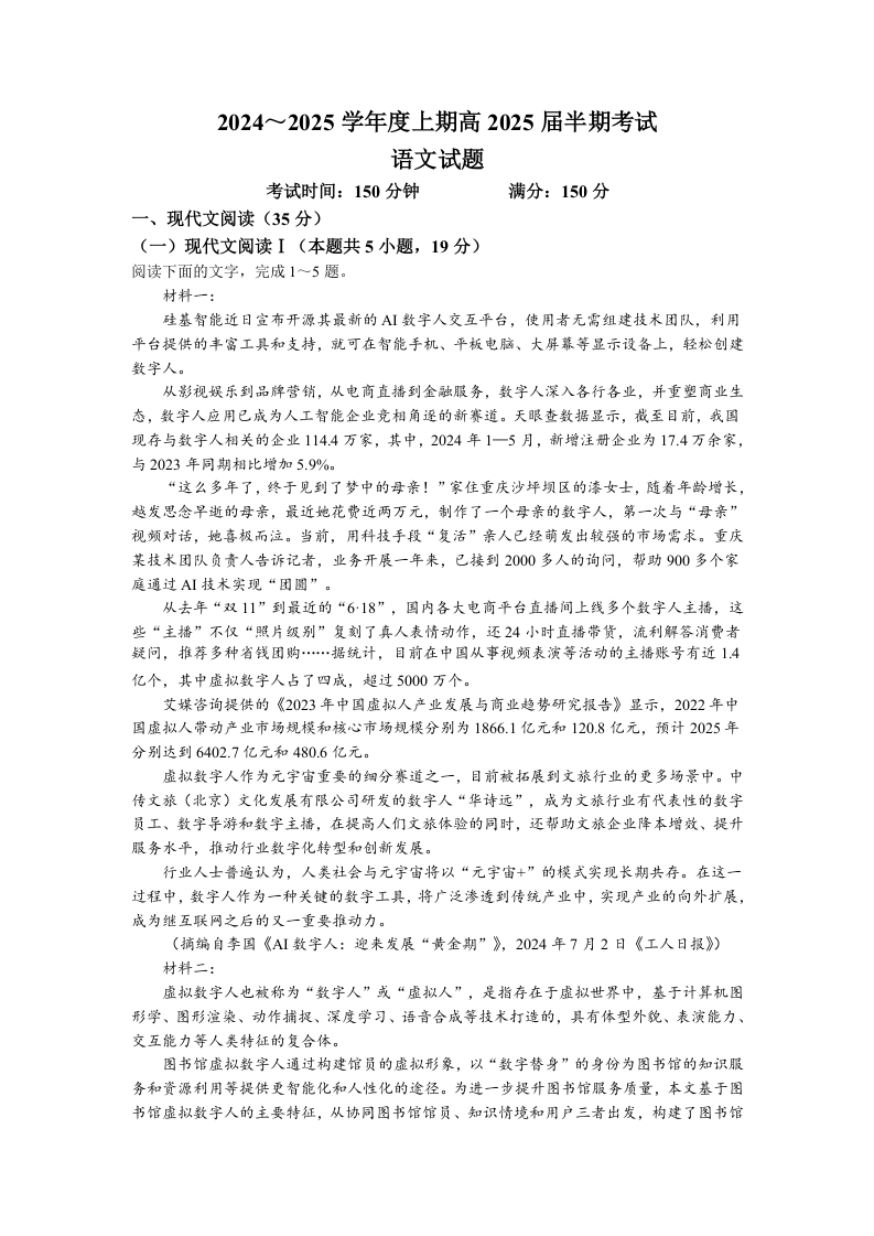 四川省成都市第七中学2024~2025学年度上期高2025届半期考试语文及答案