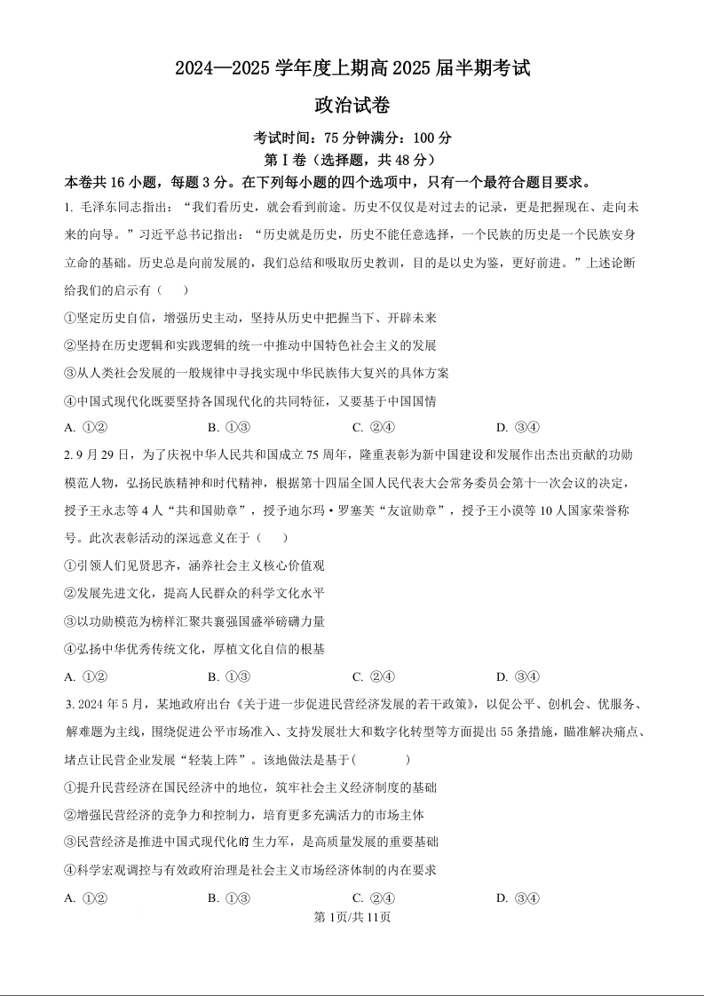 四川省成都市第七中学2024~2025学年度上期高2025届半期考试政治及答案