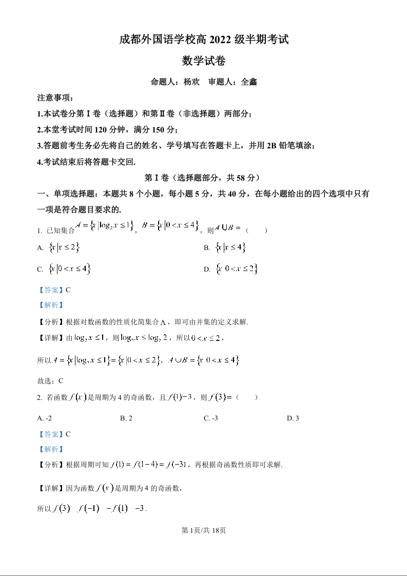 四川省成都外国语学校2025届高三上学期11月期中考试数学答案