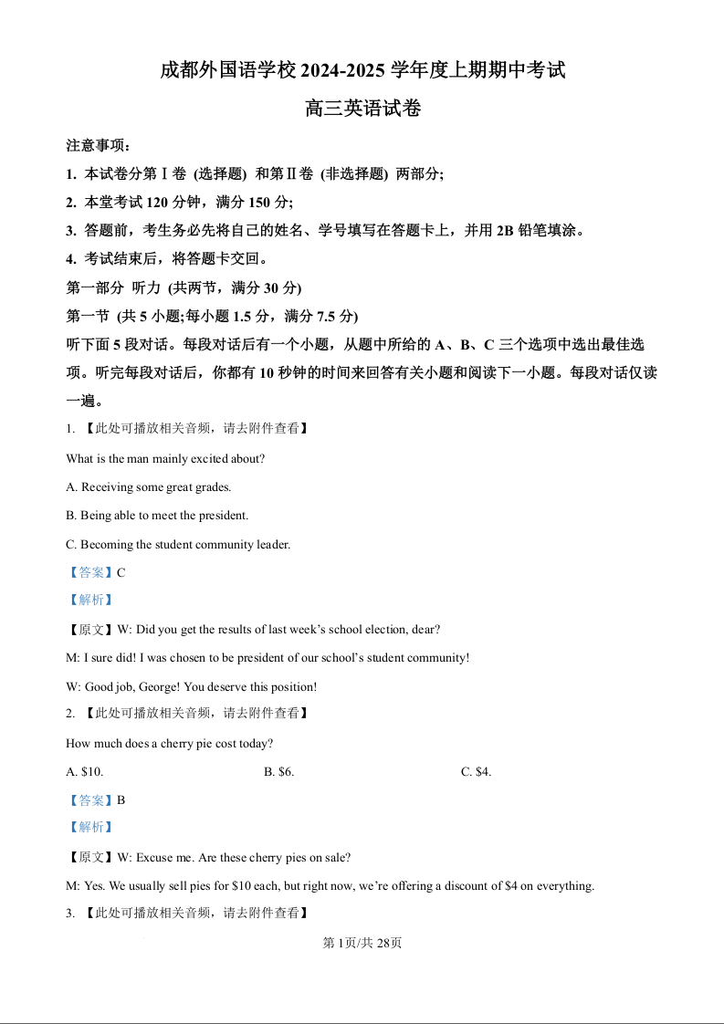 四川省成都外国语学校2025届高三上学期11月期中考试英语答案
