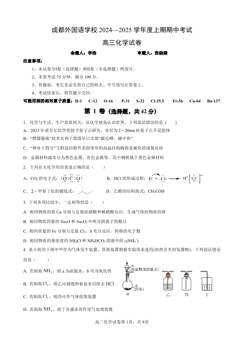 四川省成都外国语学校2025届高三上学期11月期中考试化学