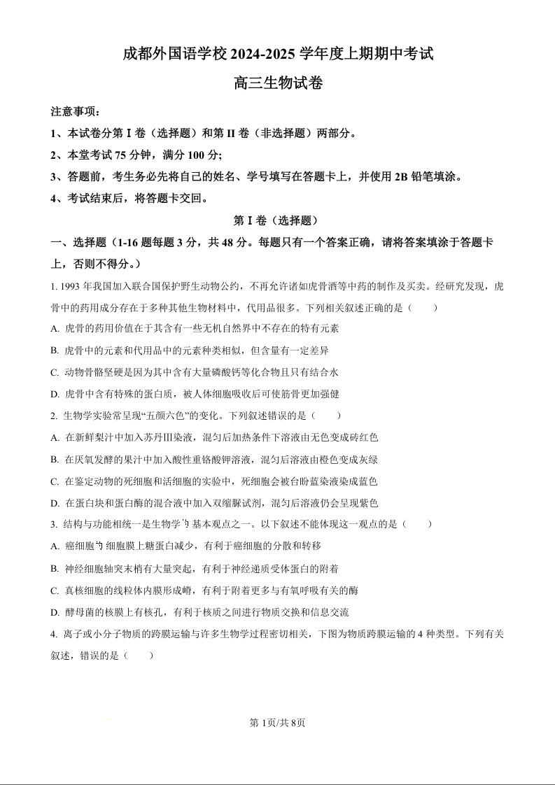 四川省成都外国语学校2025届高三上学期11月期中考试生物