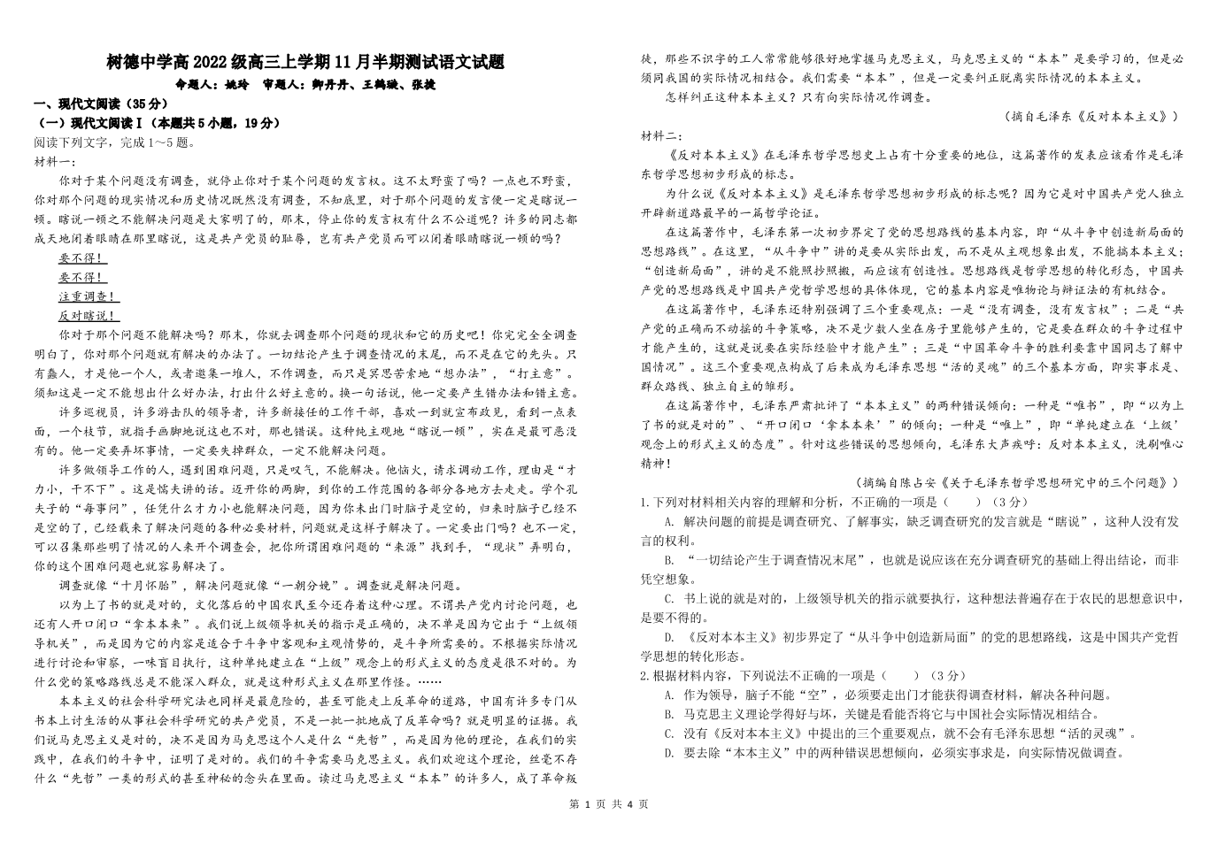 四川省成都市树德中学2025届高三上学期期中考试语文