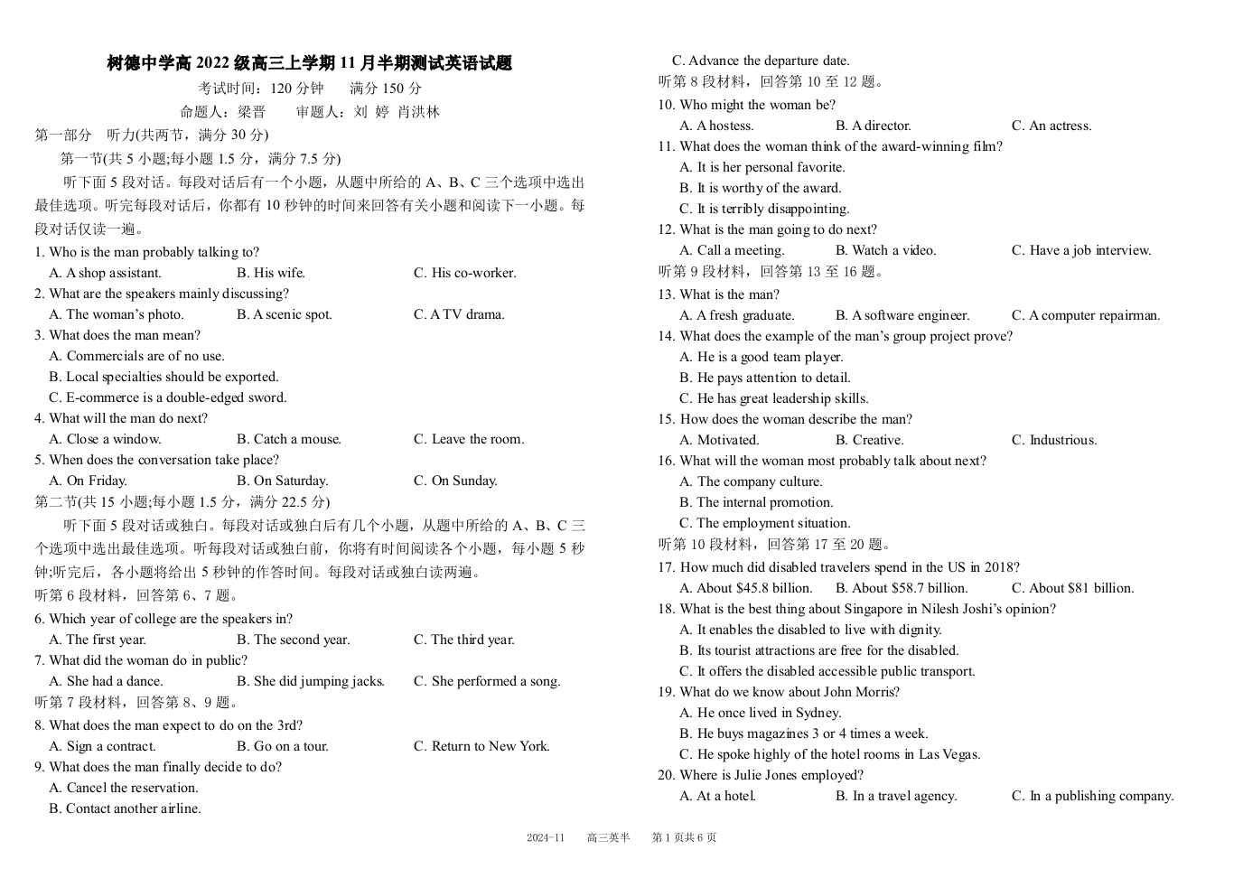 四川省成都市树德中学2025届高三上学期期中考试英语及答案