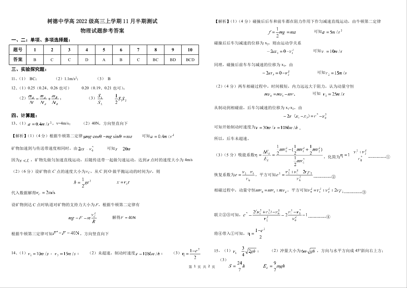 四川省成都市树德中学2025届高三上学期期中考试物理答案