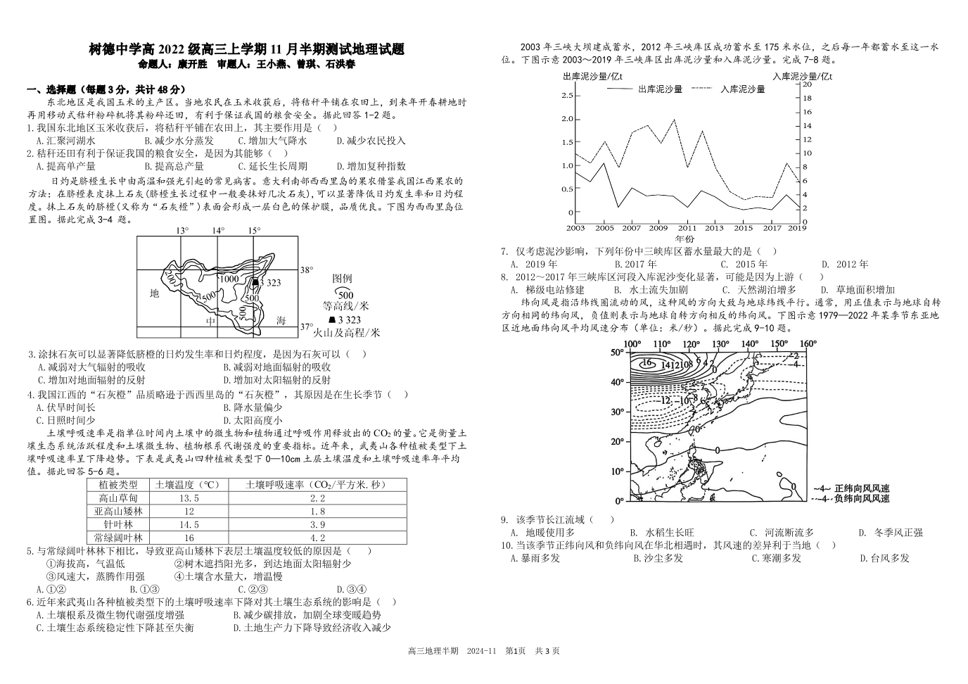 四川省成都市树德中学2025届高三上学期期中考试地理及答案