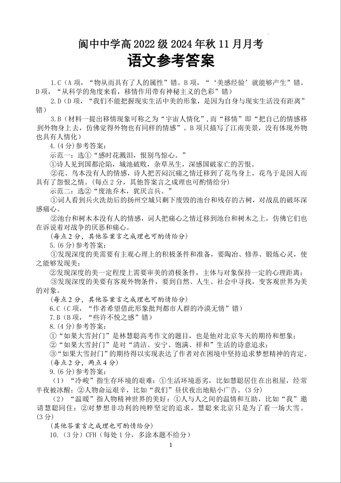 四川省南充市阆中中学2025届高三上学期11月月考语文答案