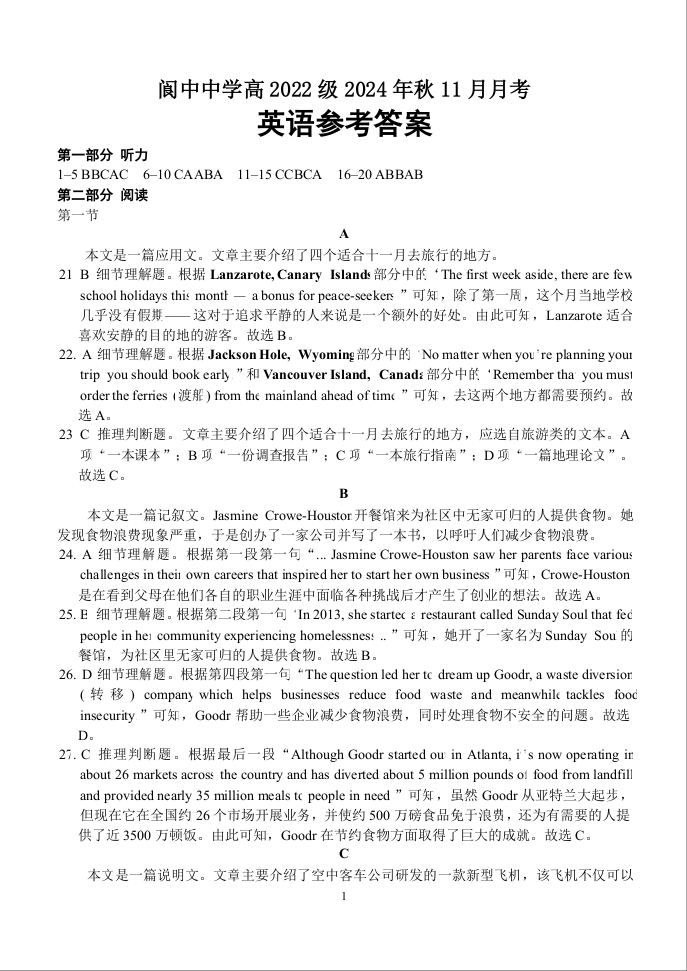 四川省南充市阆中中学2025届高三上学期11月月考英语答案