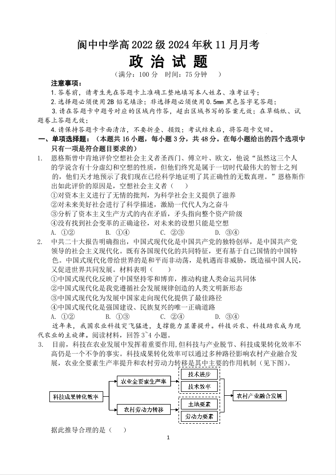 四川省南充市阆中中学2025届高三上学期11月月考政治及答案