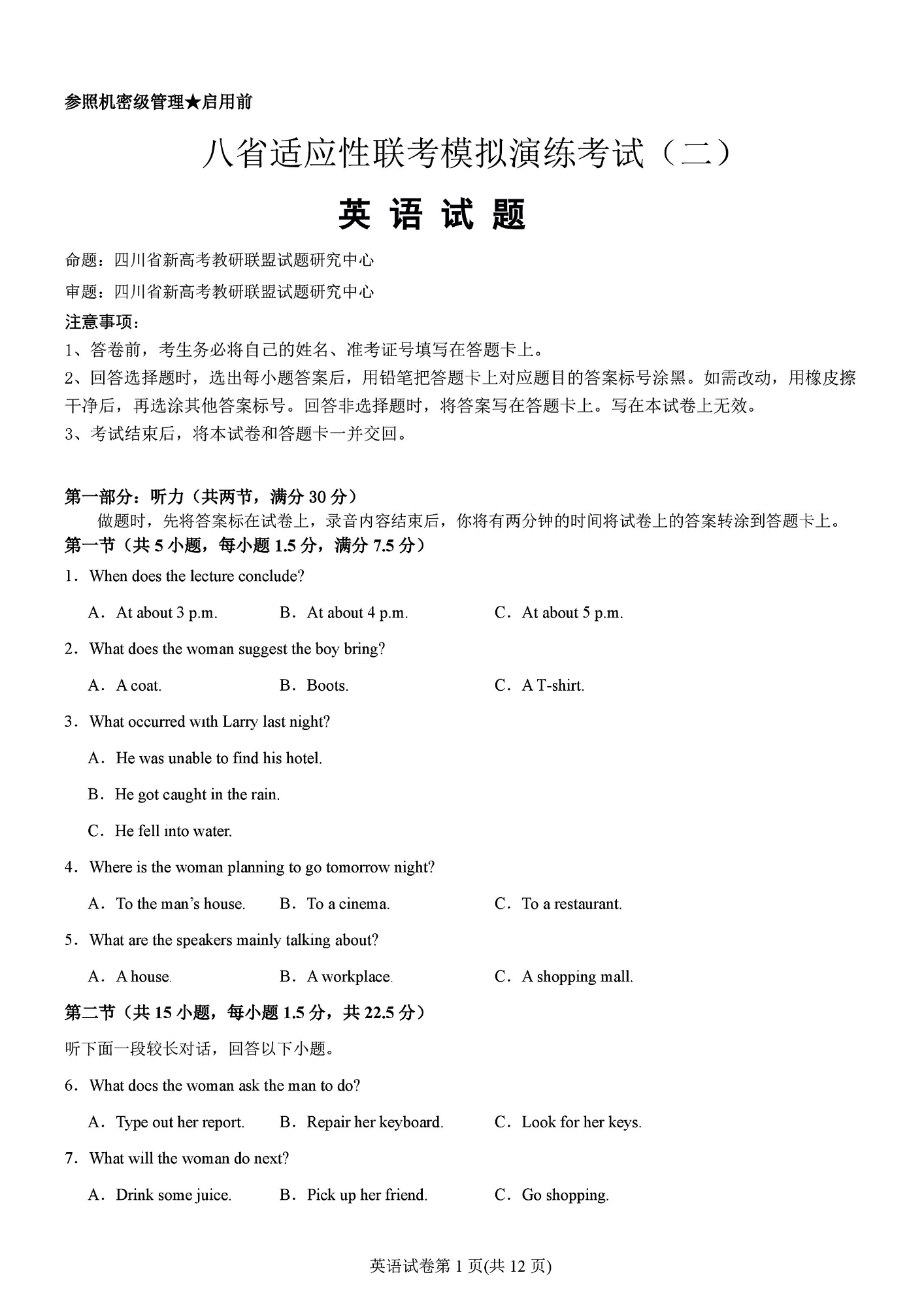四川省新高考教研联盟2025届高三上学期八省适应性联考模拟演练考试(二)英语