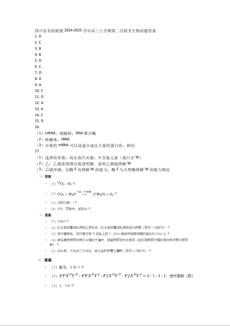 四川省名校联盟2024-2025学年高三上学期第二次联考生物试题答案