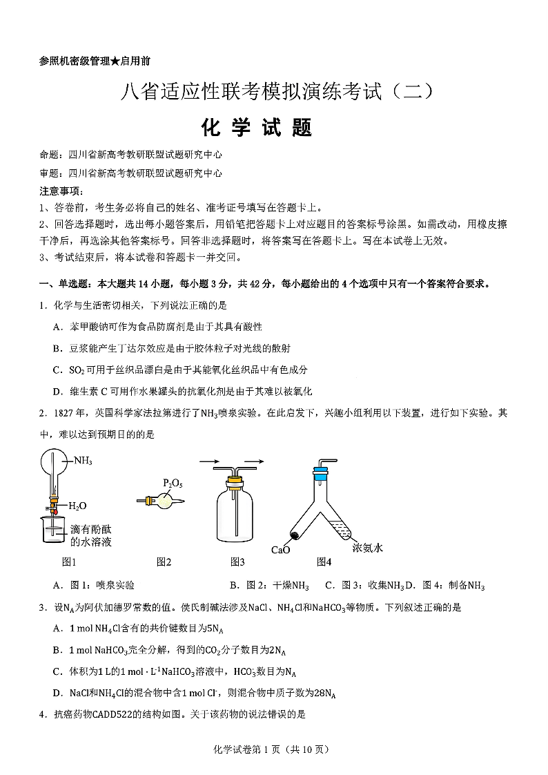 四川省新高考教研联盟2025届高三上学期八省适应性联考模拟演练考试(二)化学
