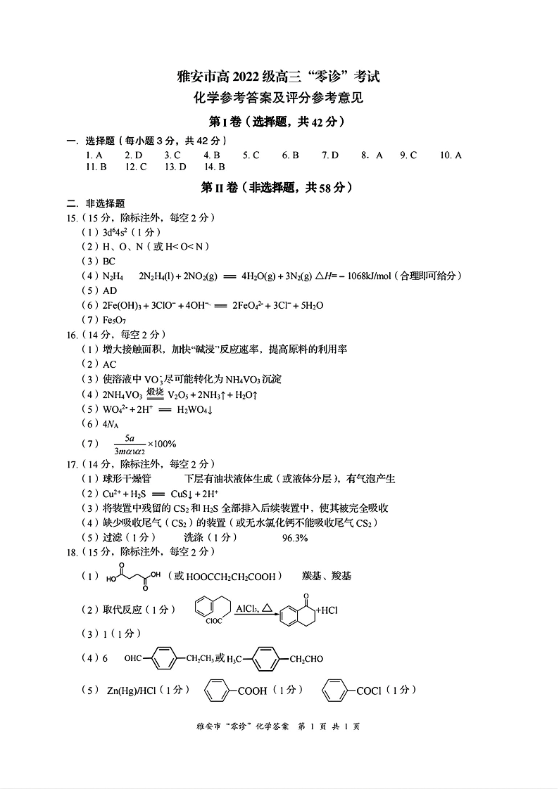 四川省雅安市2024-2025学年高三上学期11月零诊试题化学答案