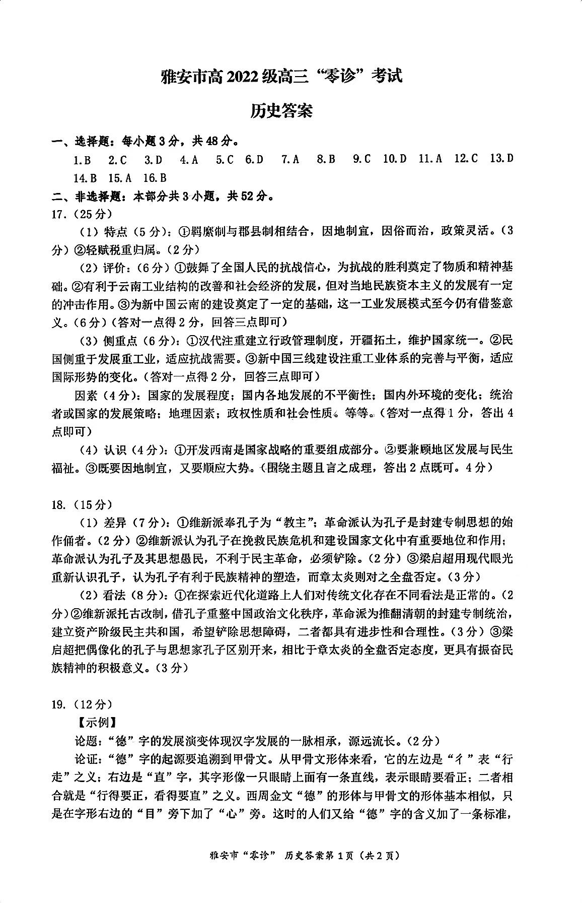四川省雅安市2024-2025学年高三上学期11月零诊试题历史答案