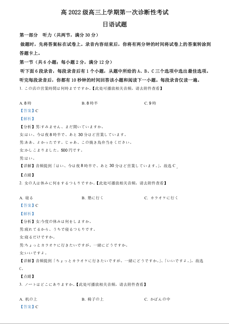 四川省宜宾市叙州区高2022级高三上学期第一次诊断性考试日语答案