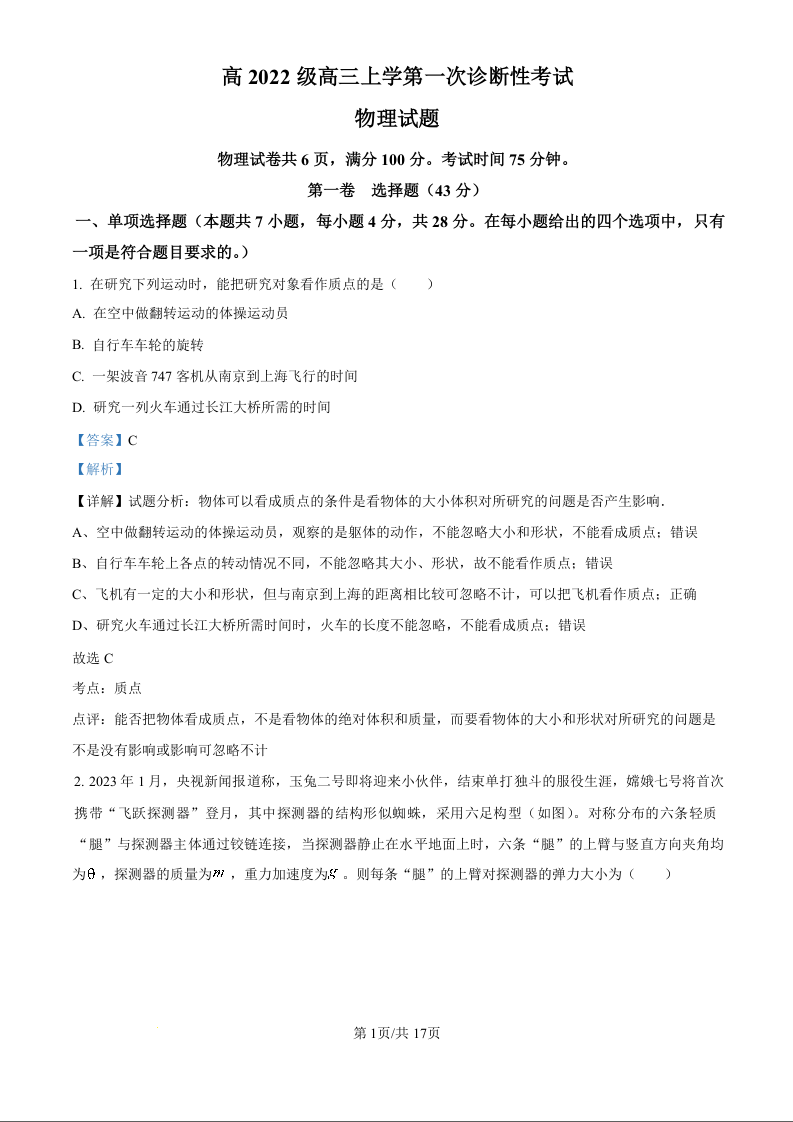 四川省宜宾市叙州区高2022级高三上学期第一次诊断性考试物理答案