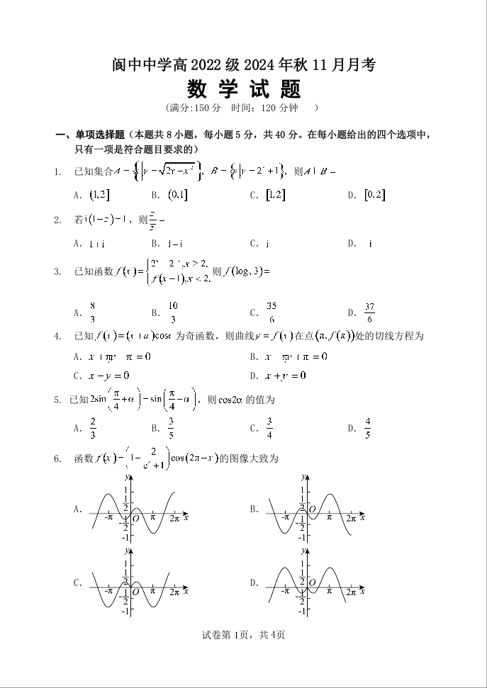 四川省南充市阆中中学2025届高三上学期11月月考数学