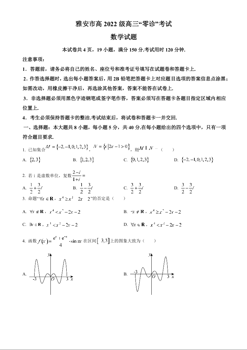四川省雅安市2024-2025学年高三上学期11月零诊试题 数学 Word版含答案