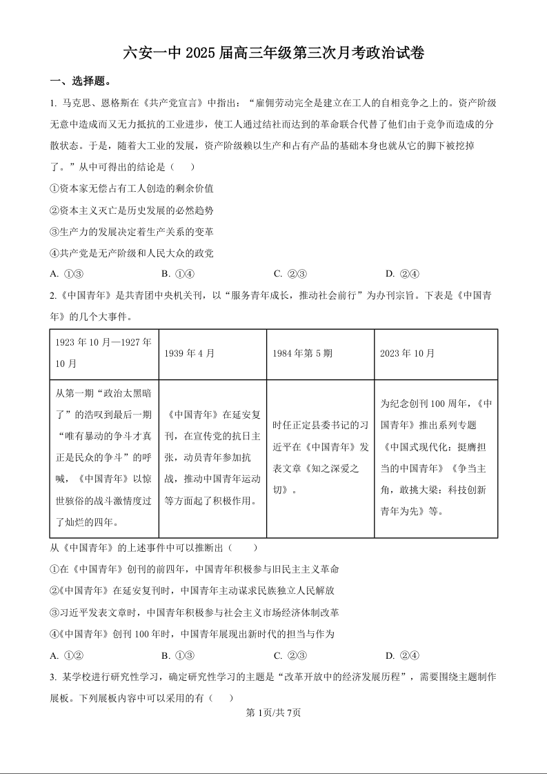安徽省六安第一中学2025届高三上学期第三次月考(11月)政治(原卷版)