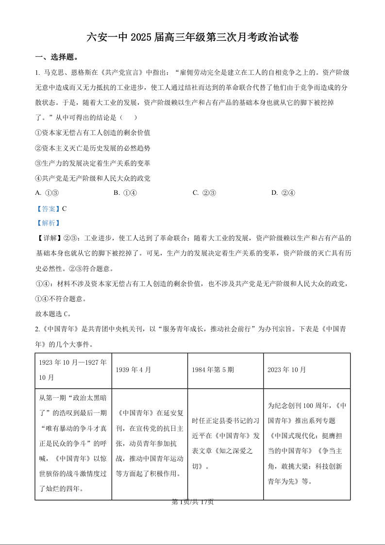 安徽省六安第一中学2025届高三上学期第三次月考(11月)政治(精品解析版)